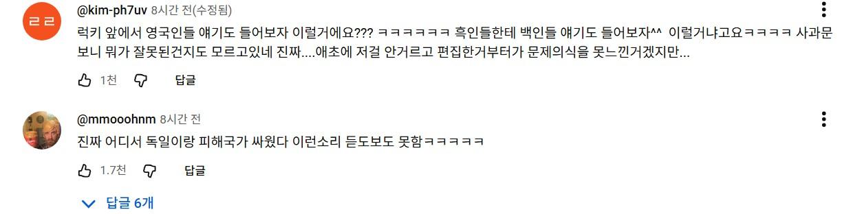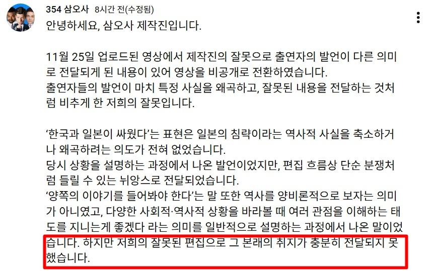 1. 알베르토, 다니엘, 럭키의 유튜브 채널 354 삼오사의 조금 전 업로드되었던 영상(논란되자 지금은 비공개)에서 일제강점기를 ‘한국과 일본이 서로 싸운 것’처럼 표현했다거나, ‘양쪽 이야기를 들어봐야 한다’는 취지의 발언이 있었다고 시청자들이 증언하며 제작진측 사과문의 댓글창은 “그럼 나치·히틀러 얘기도 양쪽 입장 들어보자고 할 거냐”며 분노가 폭발함.