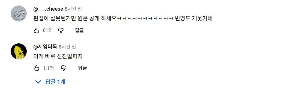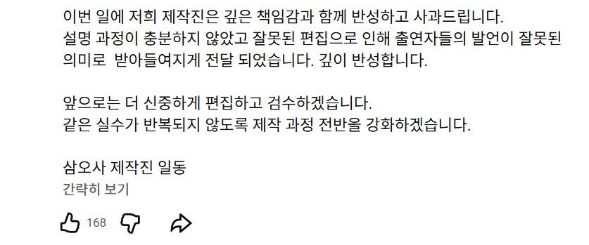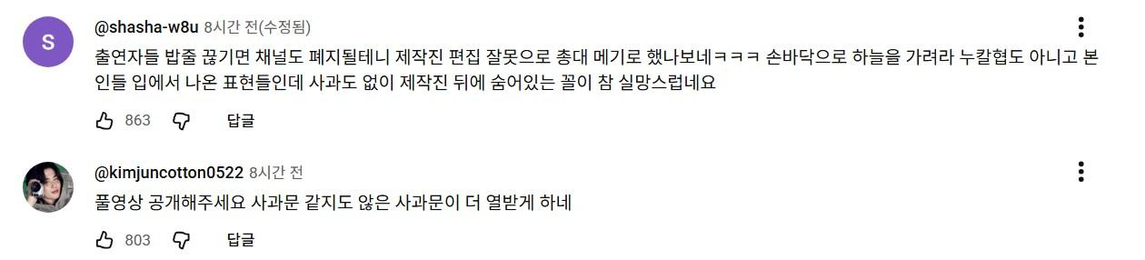 2. 제작진은 “편집 실수로 오해가 생겼다”고 사과했지만, 시청자들은 “발언 자체가 문제인데 편집 탓?”, “그럼 원본 공개하라”, “출연자 직접 사과해라”는 반응이 대부분.