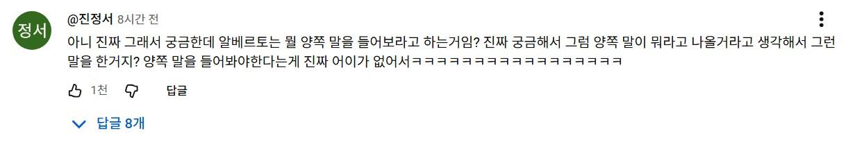 3. 전체 분위기는 “사과문이 오히려 여론에 기름을 부었다”, “역사관이 노출된 것 같다”, “알베르토 그동안 본심 숨겼나, 송진우 실망”(일본인 아내를 둔 배우 송진우씨가 출연했나 봄)이라는 강한 비판.
