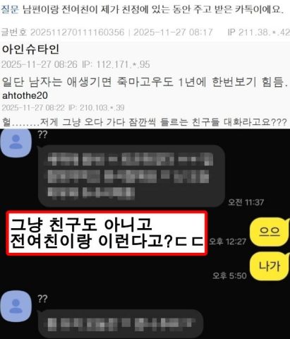남편이랑 전여친이 제가 친정에 있는 동안 주고받은 카톡이에요