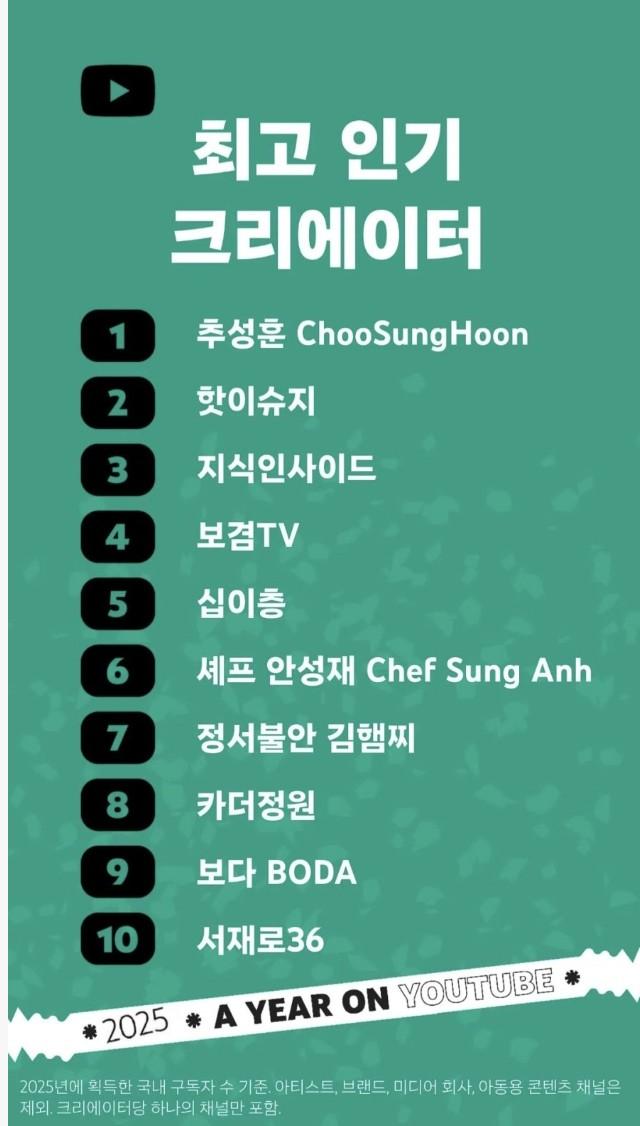 유튜브가 발표한 2025 국내 인기 유튜버 순위 ㄷㄷ