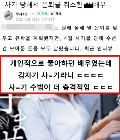 사기 당해서 은퇴를 취소한 A…브이….배우 ㄷㄷㄷ