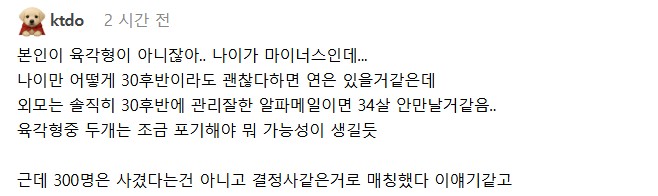 어느정도 완벽한 육각형 남자를 원하는 34살 여성 ㄷㄷㄷ